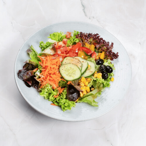 gemischter frischer Salat mit Mais, Karotten, Gurken, Paprika, Tomaten und hausgemachtem Balsamico Dressing